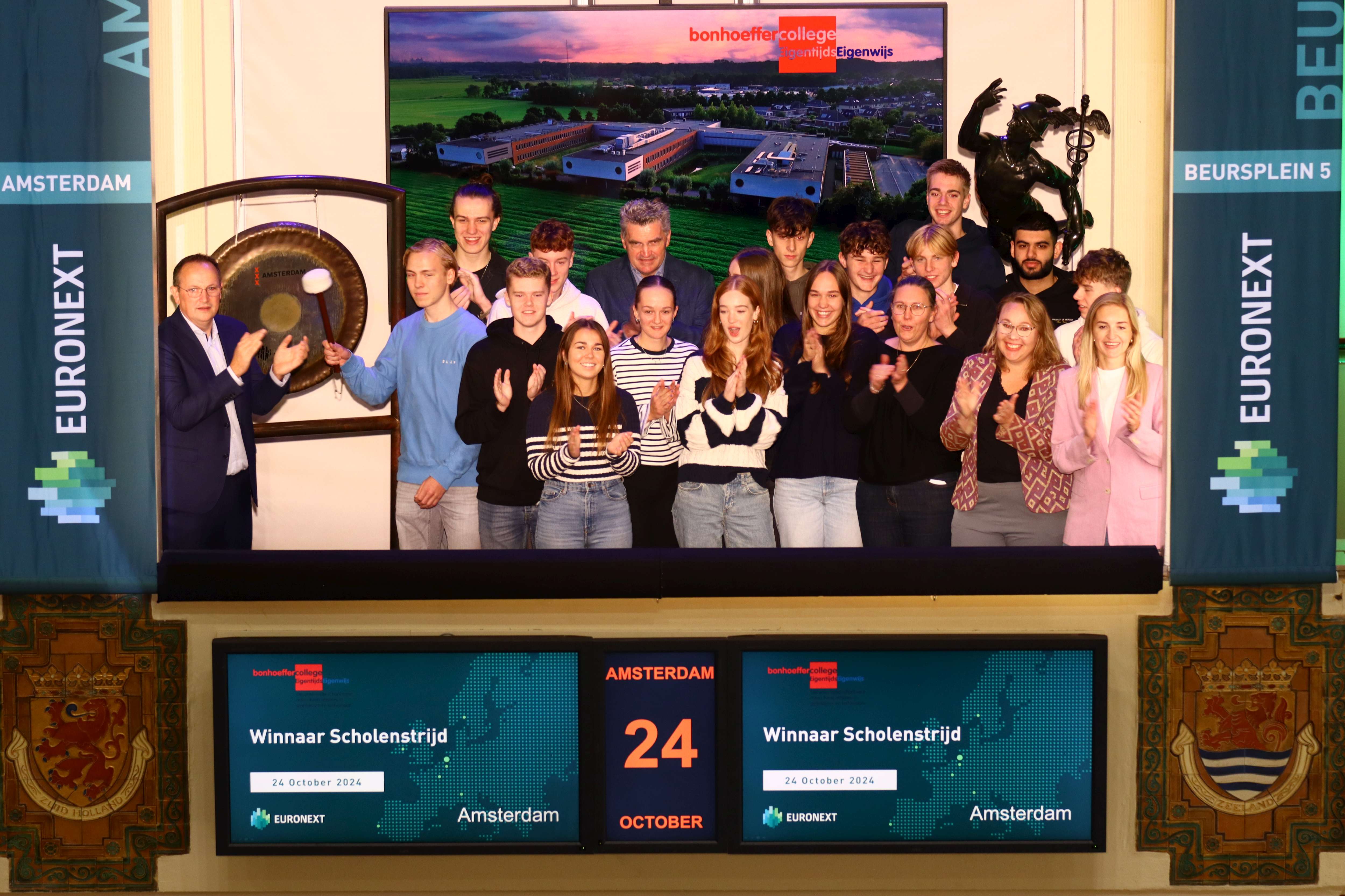 The gong was sounded by Alwin Kuipers, one of the students from vwo 6. The group was welcomed by Han Zwakenberg, Compliance Officer at Euronext Amsterdam.