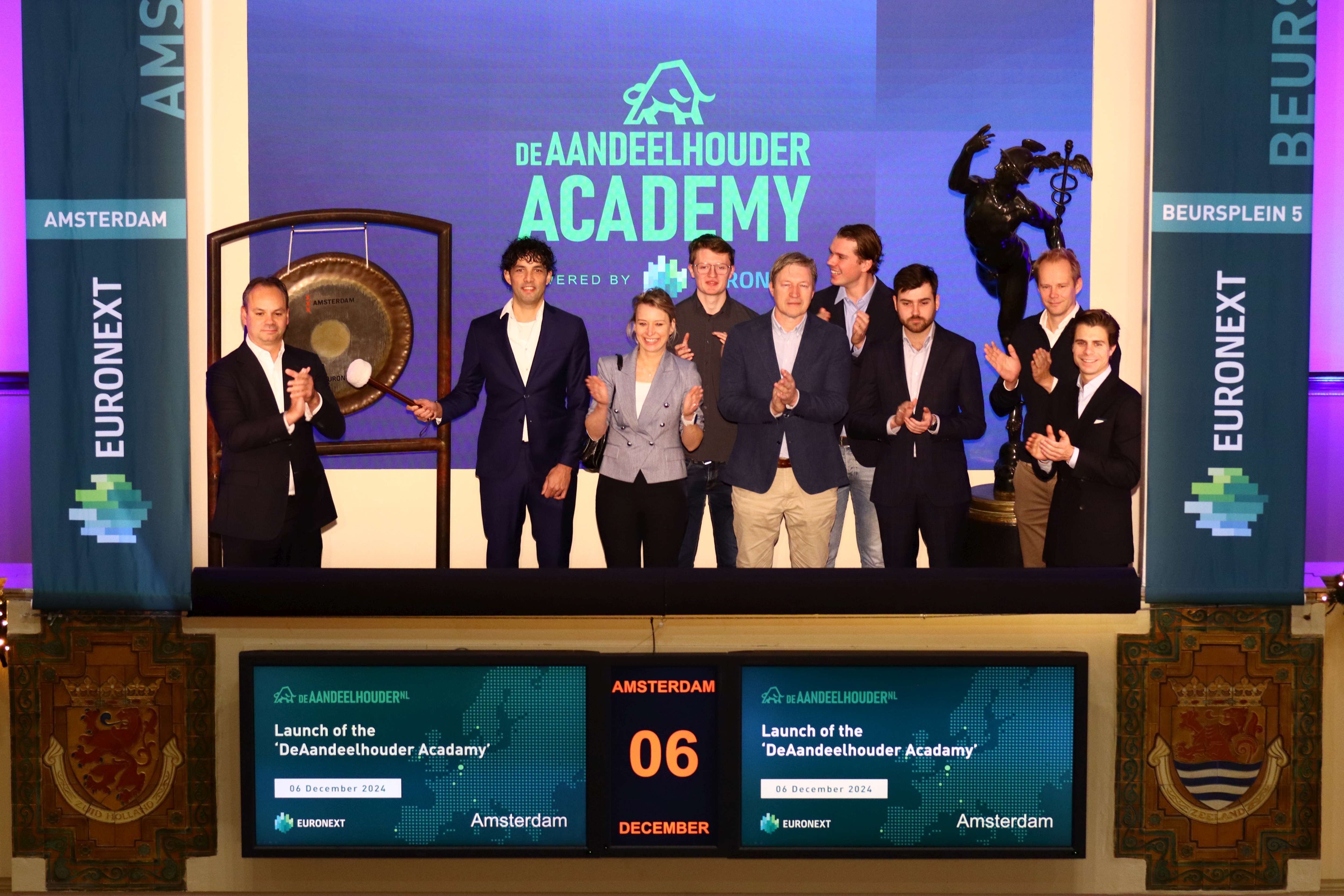 Euronext Amsterdam, the birthplace of Europe’s first options exchange, and broker Lynx proudly support this educational initiative. To celebrate the launch, the traditional gong ceremony took place this morning at Beursplein 5, where Dirk Donker, Head of Secondary Markets Benelux & Germany, welcomed the founders of De Aandeelhouder Academy.