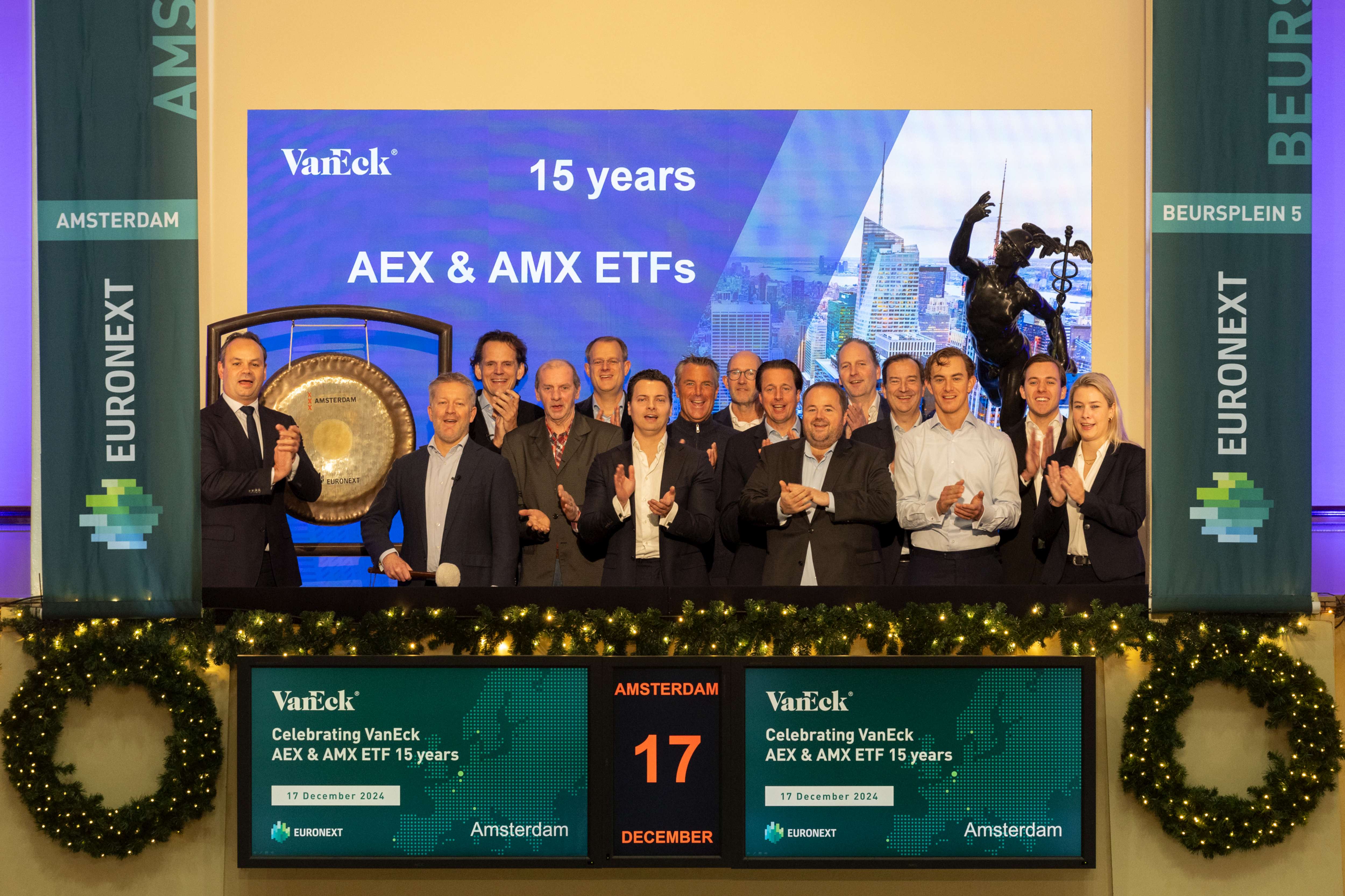 To celebrate this 15-year anniversary, the gong was sounded this morning by Martijn Rozemuller, CEO of VanEck Europe. The company was welcomed by Dirk Donker, Head of Secondary Markets Benelux & Germany and Penny Somsen, Equity Sales Benelux & Germany at Euronext Amsterdam.