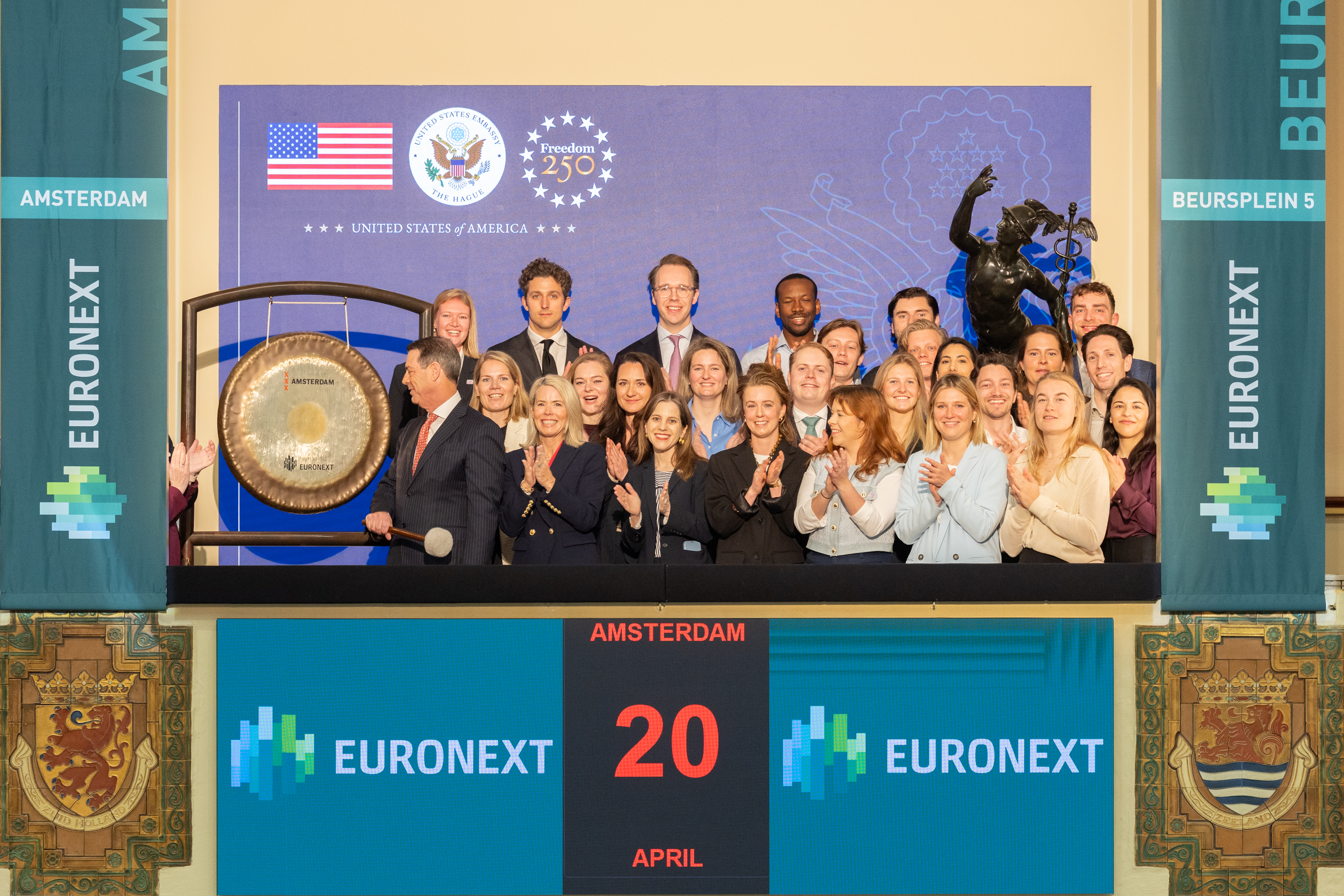 The day after Dutch-American Friendship Day, US Ambassador Popolo visited the Amsterdam exchange to sound the gong in celebration of the 250th anniversary of the United States. The visit highlighted the centuries-old relationship between the two countries, which in the fields of (International) trade and capital markets dates back to the foundations of the US economy.