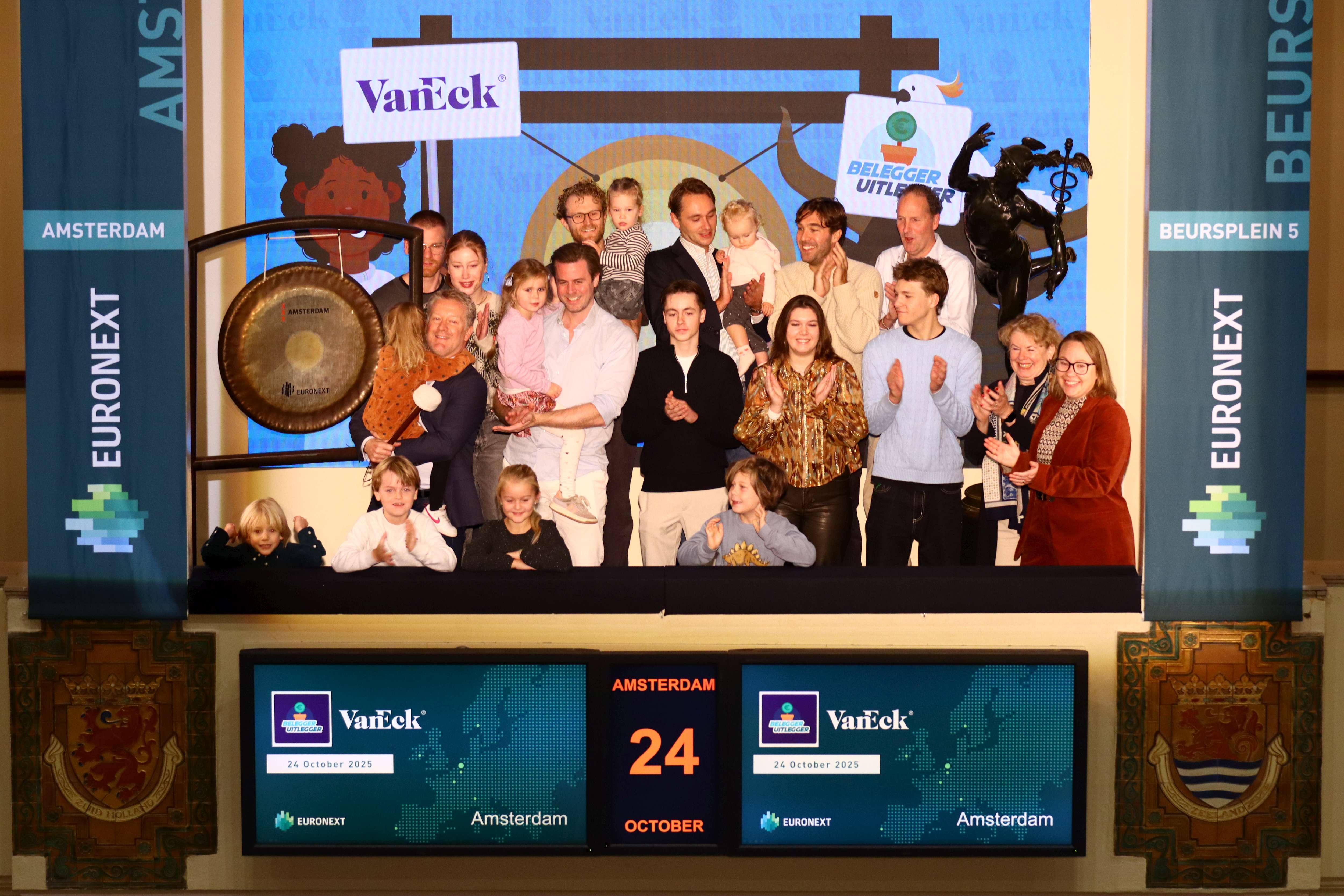 The team from VanEck and BeleggerUitlegger sounded the gong at Euronext Amsterdam this morning to mark the start of their collaboration. Children of VanEck employees joined them on stage to share in the celebration.