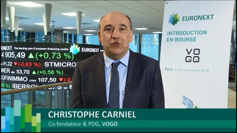 Les marchés d'Euronext Paris sont ouverts par la cérémonie d'ouverture des marchés de VOGO. Christophe Carniel, Président et Co-fondateur, sonne la cloche en cette occasion.