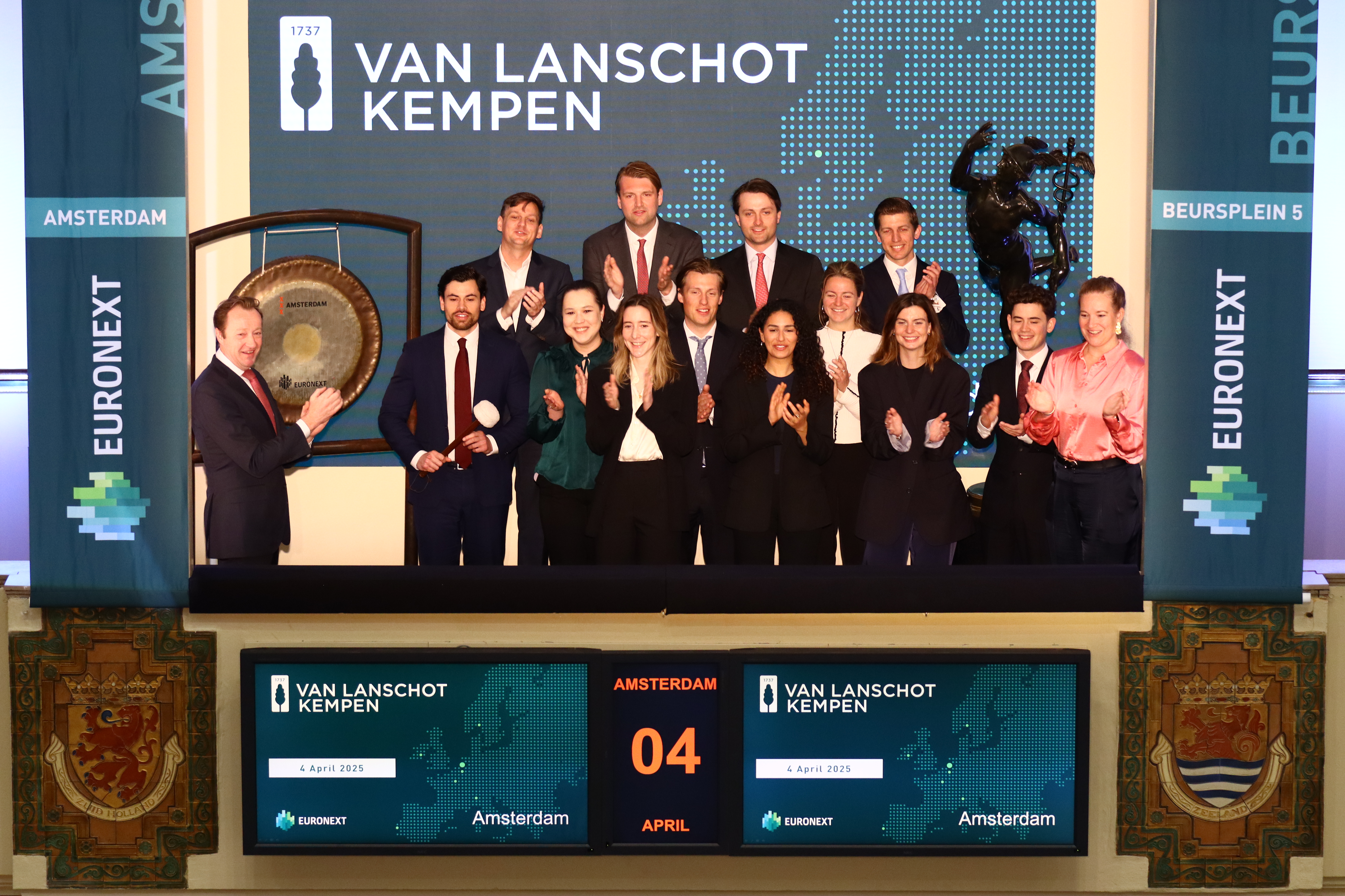 On the occasion of the conference, David Rijkse, Equity sales, rang the gong today at Beursplein 5. The Van Lanschot Kempen team was welcomed by Christine van den Bos, Listing Director and Paul Noordam, Senior Sales Manager, of Euronext Amsterdam.
