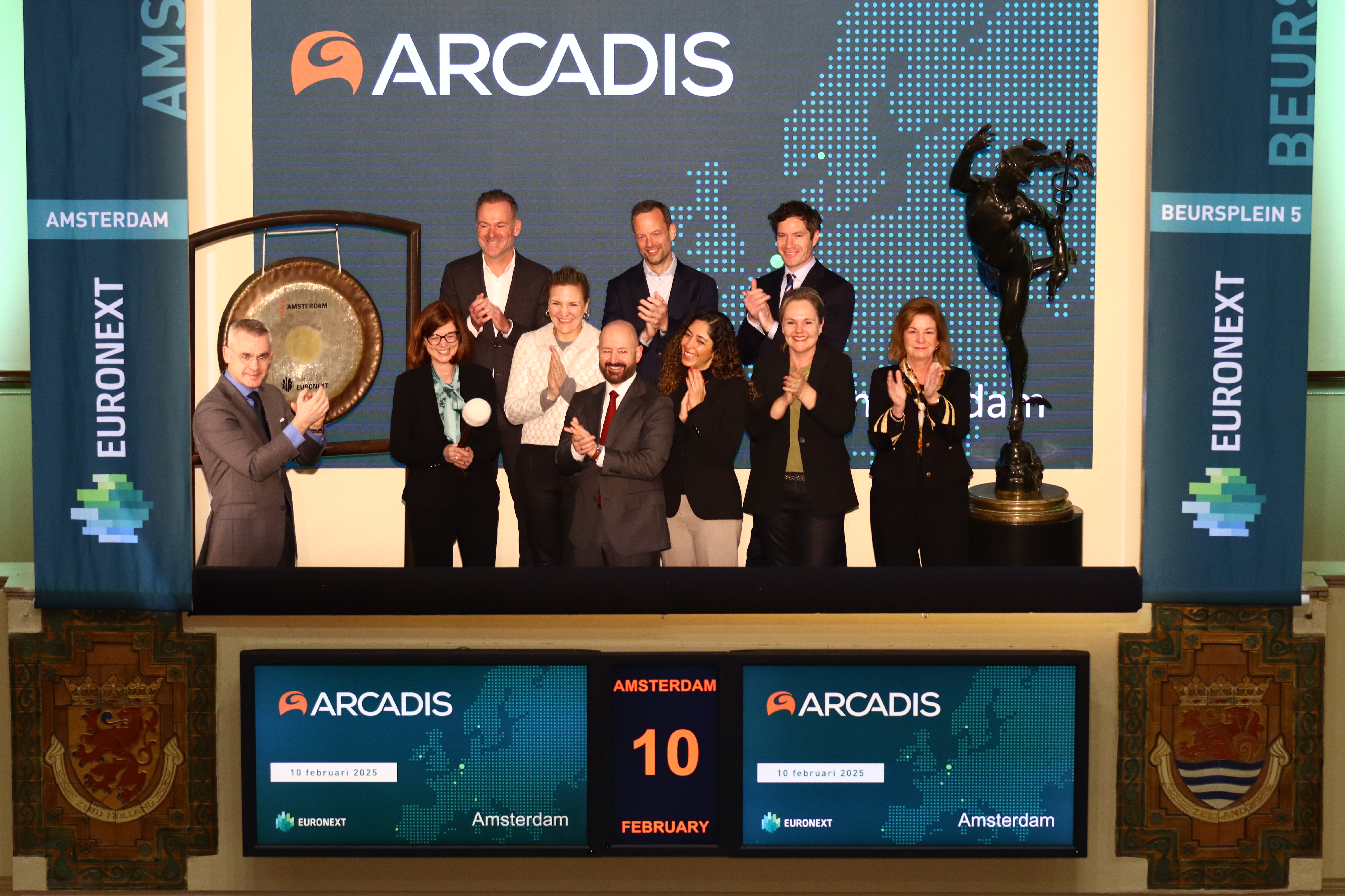 To mark this milestone, the traditional gong ceremony was performed this morning by Virginie Duperat-Vergne, Chief Financial Officer of Arcadis. The ceremony was attended by René van Vlerken, CEO of Euronext Amsterdam, who warmly welcomed the Arcadis team.