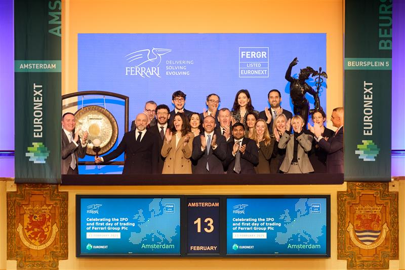 The team of Ferrari Group was welcomed for a traditional Gong Ceremony by René van Vlerken, CEO of Euronext Amsterdam.