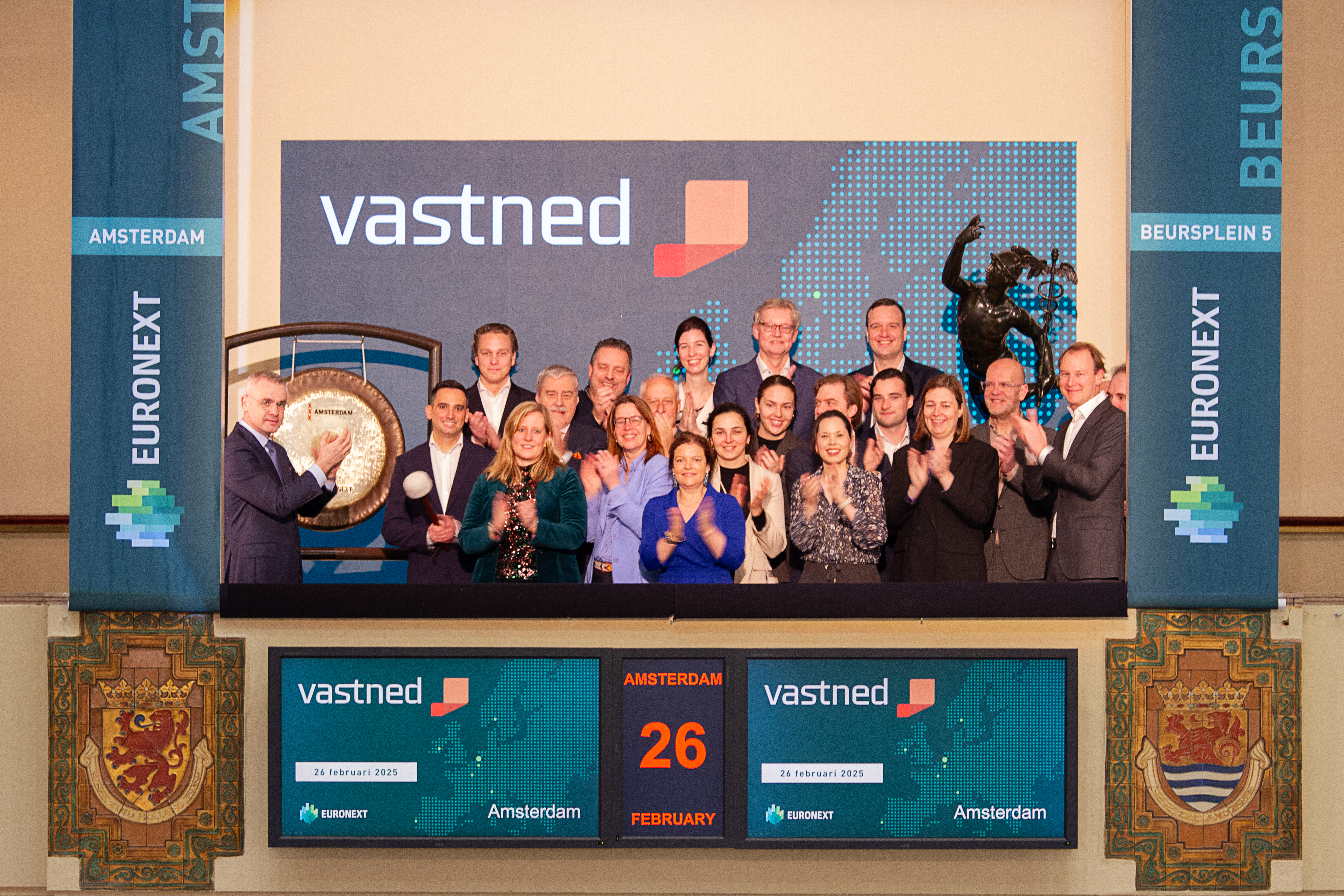 Vastned celebrated the introduction of its shares on Euronext Amsterdam today with a traditional Gong ceremony at the Amsterdam exchange. Sven Bosman, CEO of Vastned, struck the gong and the group was welcomed by René van Vlerken, CEO of Euronext Amsterdam