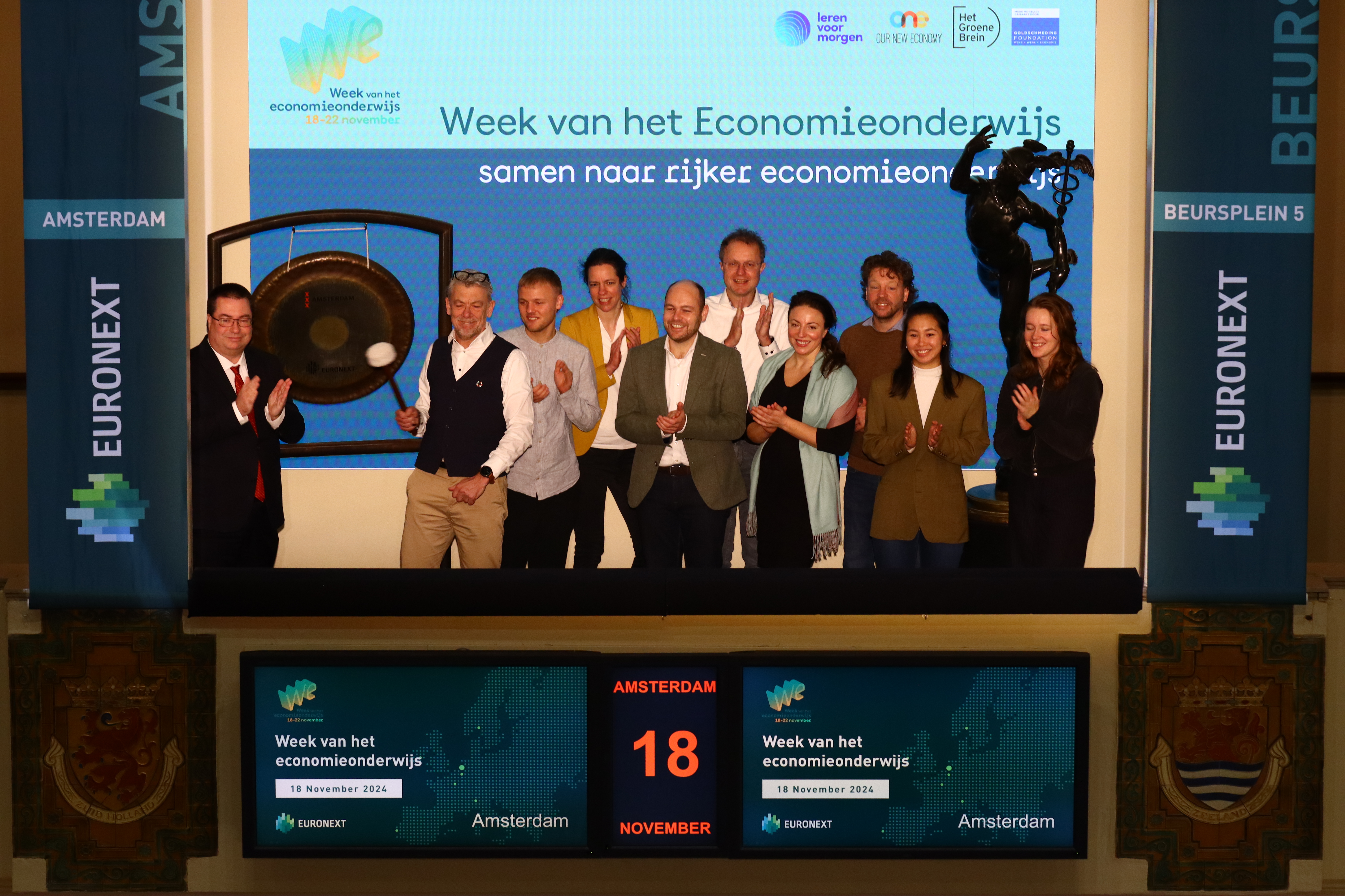 Euronext Amsterdam, the birthplace of Europe’s first options exchange, and broker Lynx proudly support this educational initiative. To celebrate the launch, the traditional gong ceremony took place this morning at Beursplein 5, where Dirk Donker, Head of Secondary Markets Benelux & Germany, welcomed the founders of De Aandeelhouder Academy.