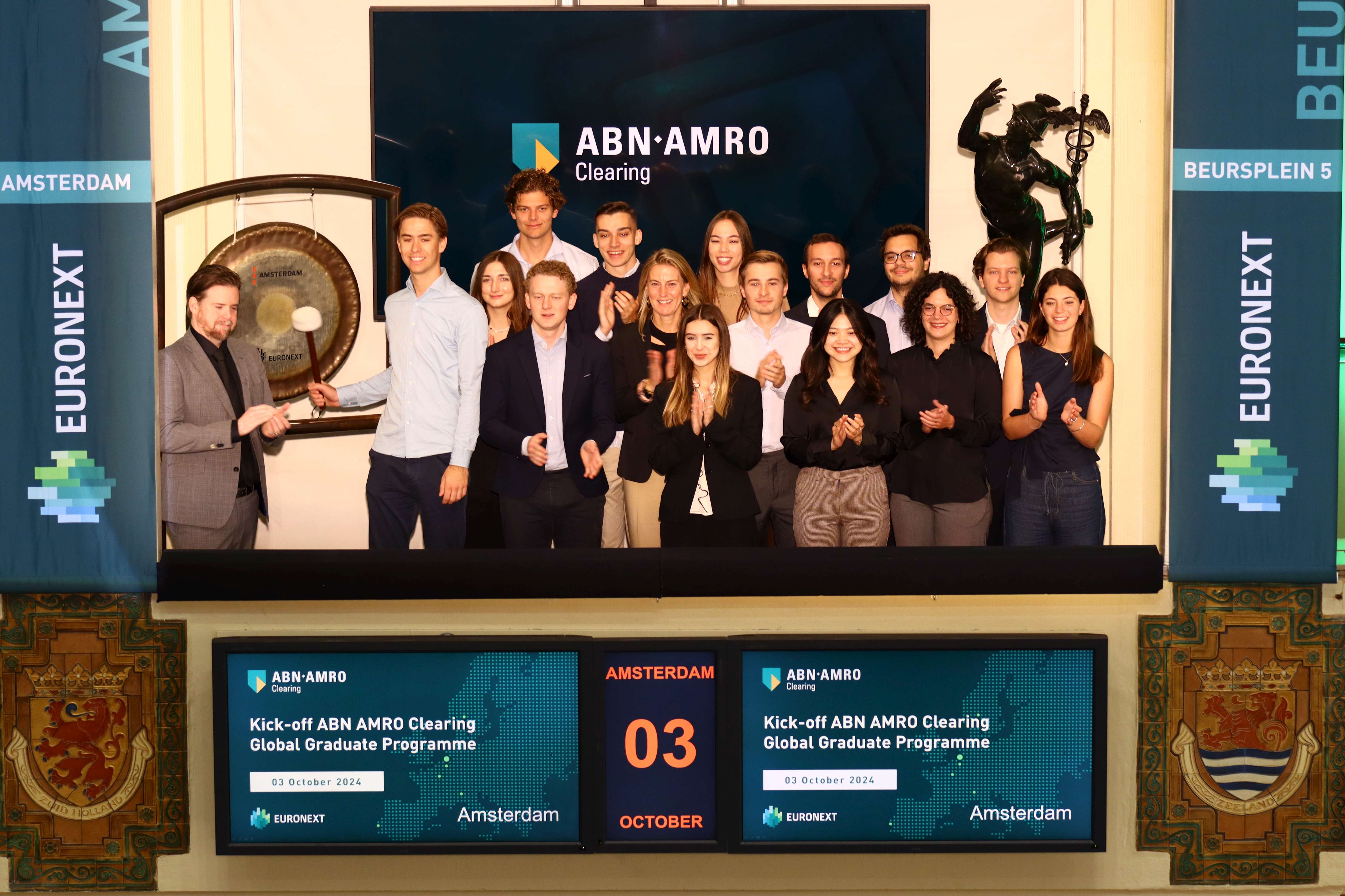 During the first month industry experts, professional trainers and ABN AMRO Clearing managers have facilitated different sessions to give the young talents a solid basis. As of now, they are ready to embrace different assignments to prepare them for a role in the dynamic world of Clearing within 12 months.This year’s cohort was welcomed this morning by Jeroen Hofs, Head of Licensing Operation, Market Data, at Euronext Amsterdam to open a new trading day and get a glimpse of the Amsterdam Stock Exchange.