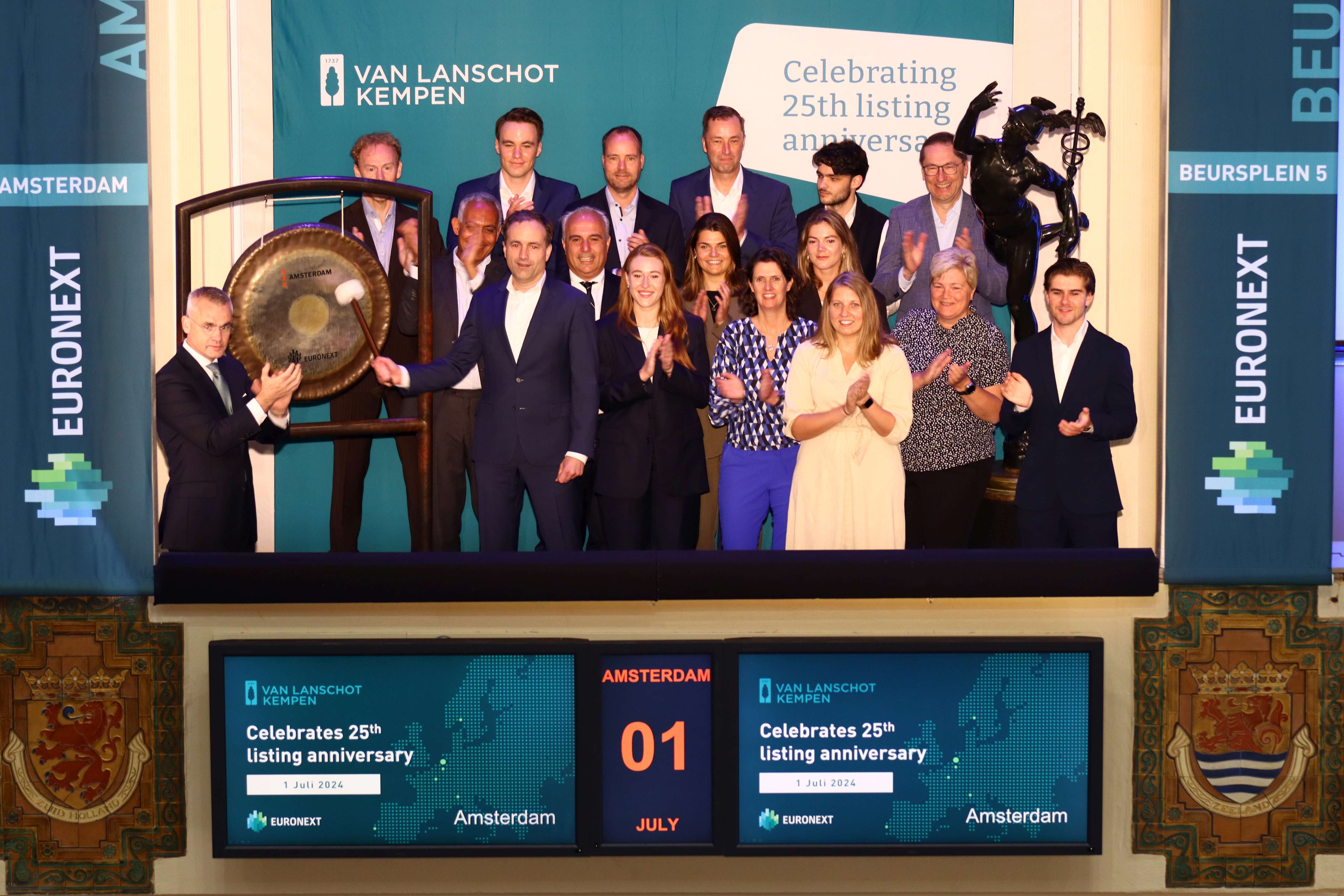 To celebrate the 25th listing anniversary of Van Lanschot Kempen, Jeroen Kroes, the company's CFO, rang the gong today. The group was welcomed by René van Vlerken, Head Primary Markets the Netherlands & Germany CEE, Euronext Amsterdam.