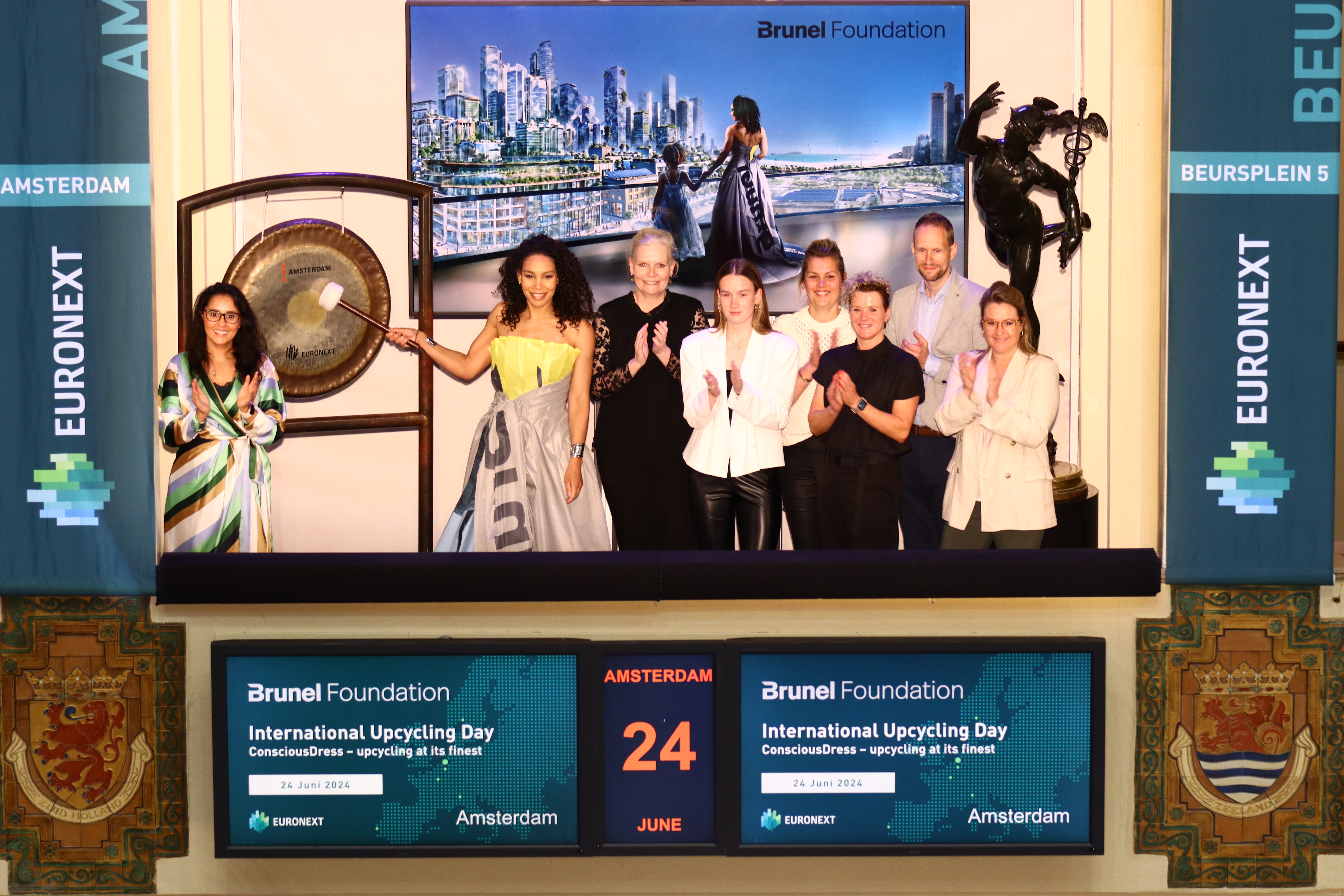 A few years ago, Brunel started to upcycle used materials into something new as part of its Building New Habits strategy. Now, on International Upcycle Day, they are taking upcycling at Brunel to the next level, with their unique upcycled ConsciousDress. Marrying the Brunel Foundation’s sustainability activities with Brunel’s focus on innovation, Bruneller Amanda Linger, who sounded the gong today, travels the world in the ConsciousDress, using the power of Artificial Intelligence. The group was welcomed by Ibtissam Gzouny, HR Director NL at Euronext Amsterdam.