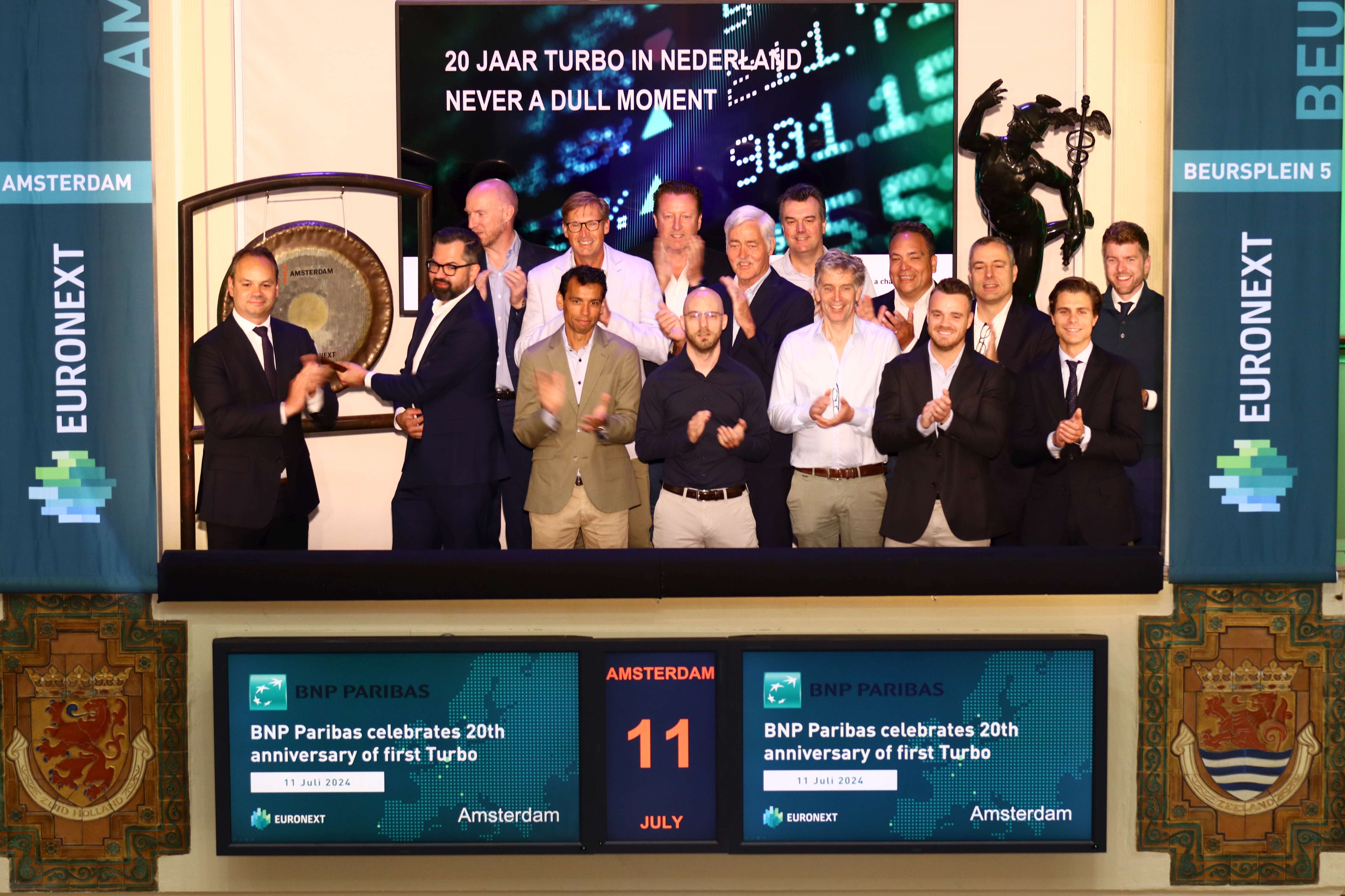 The gong sounded today to celebrate 20 years since the BNP Paribas Markets Turbo was issued. A Turbo is an investment product that allows investors to invest with leverage in various underlying assets such as shares, indices, currencies, bonds, commodities and mutual funds.