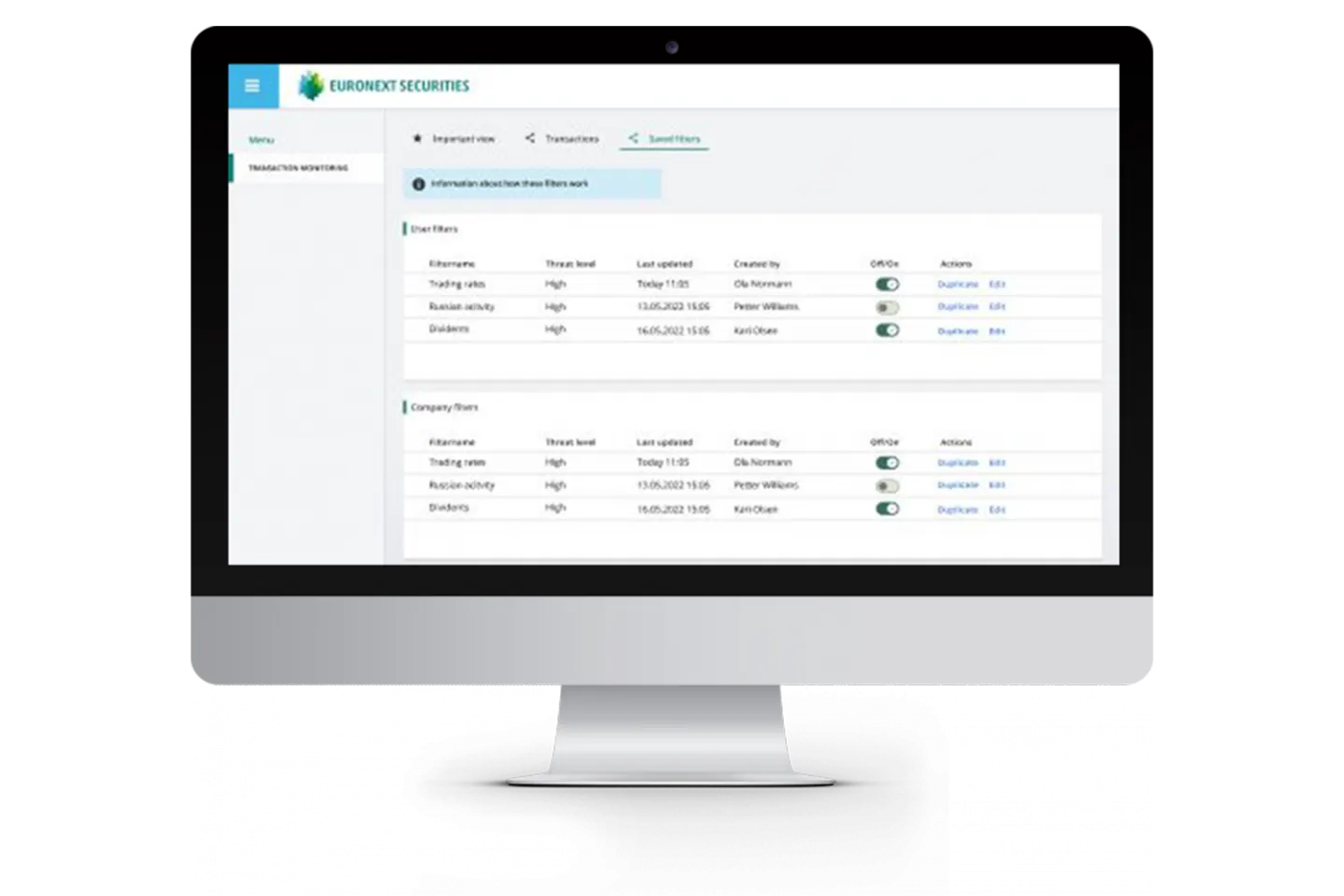 Transaction Monitoring er et produkt som hjelper finansinstitusjoner og selskaper i finansmarkedet med å automatisere prosessen med å daglig overvåke millioner av finansielle transaksjoner. Brukere kan sette opp tilpassede verdier for spesifikke transaksjoner, investorer av interesse, internasjonale transaksjoner samt motta varsler når denne type aktivitet forekommer. I tillegg til en omfattende oversikt over sine kunders aktivitet, er det også inkludert en historikk over alle transaksjonene deres samt muligheten til å se nærmere på spesifikke transaksjoner for mer detaljert analyse. Be om en demo i dag!