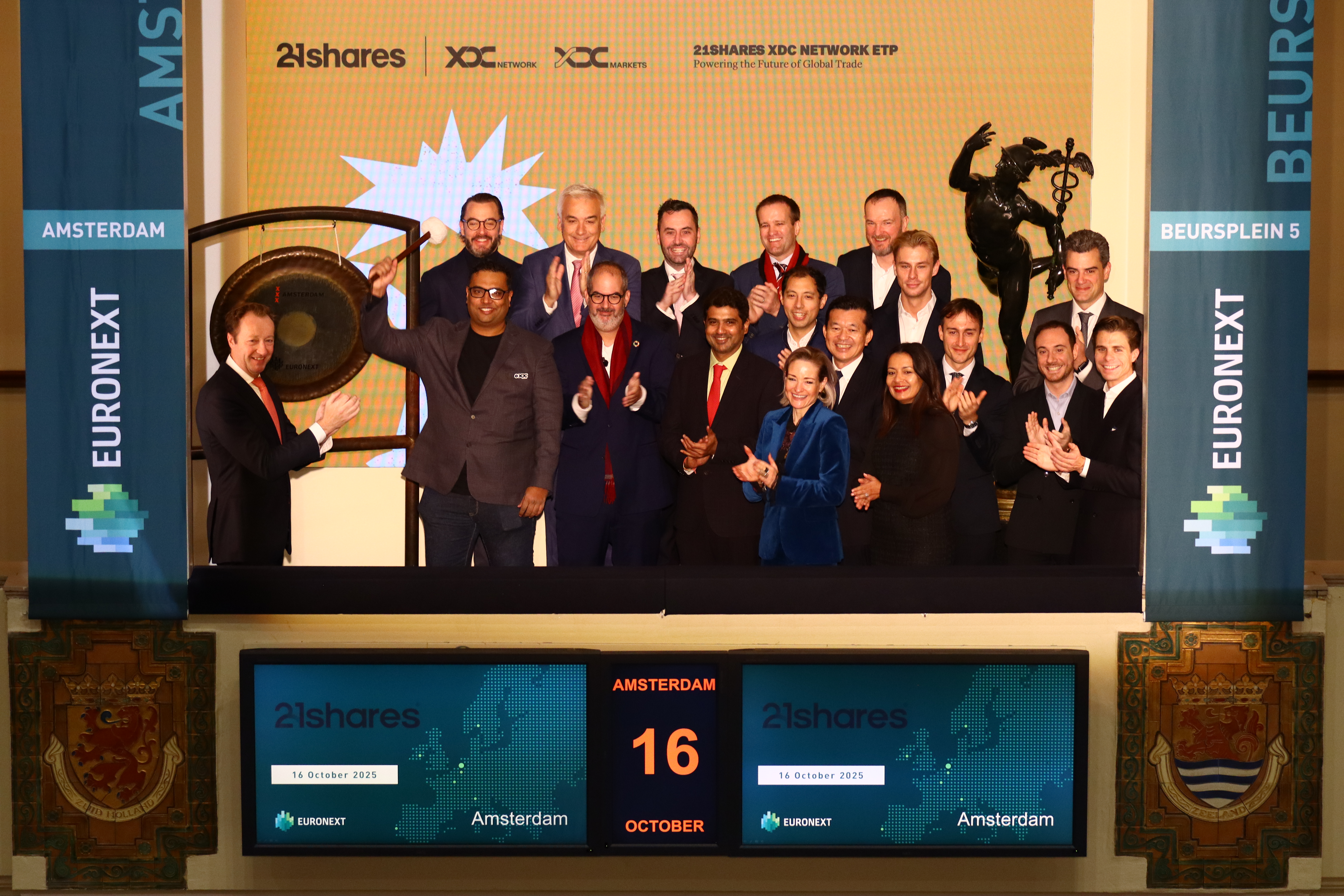 Alistair Byas-Perry, hoofd EU Investments Capital Markets bij 21Shares, opende vandaag de handelsdag met een gongceremonie op Euronext Amsterdam ter gelegenheid van de lancering van het XDC Network ETP (ticker: XDCN).