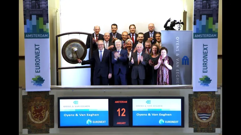Oyens & Van Eeghen opent ter ere van de overname door Delen Private Bank de handel op beursplein 5. CEO Pim Baljet luidt de gong. Delen Private Bank is onderdeel van het aan Euronext Brussel genoteerde Ackermans en Van Haren (ticker symbol: ACKB).