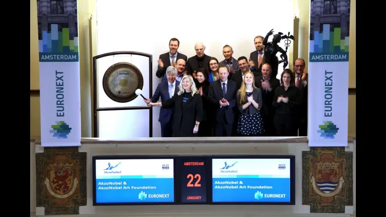 AkzoNobel opent de handel op de Amsterdamse beurs ter gelegenheid van het nieuwe AkzoNobel Center inclusief de AkzoNobel Art Space aan de Amsterdamse Zuidas. De gong wordt geslagen door Piet Schalkwijk, Corporate Director Special Projects bij AkzoNobel en Hester Alberdingk Thijm, Directeur van de AkzoNobel Art Foundation.
