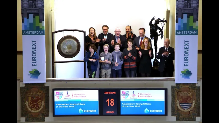 De winnaar van de ACTIAM beursexpert enquête opent met een slag op de gong de handel op de Amsterdamse beurs.