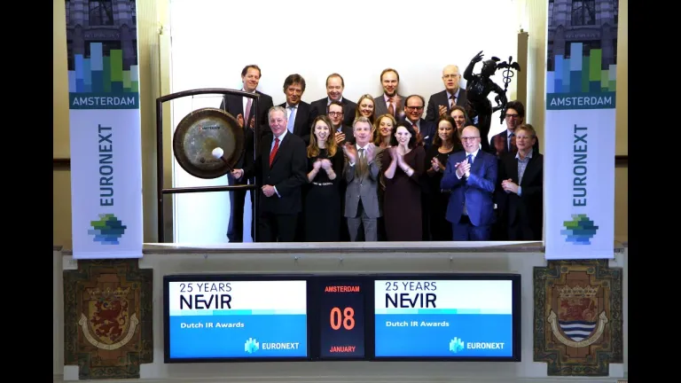 De winnaars van de Dutch IR Awards bezoeken Beursplein 5 voor het luiden van de beursgong.