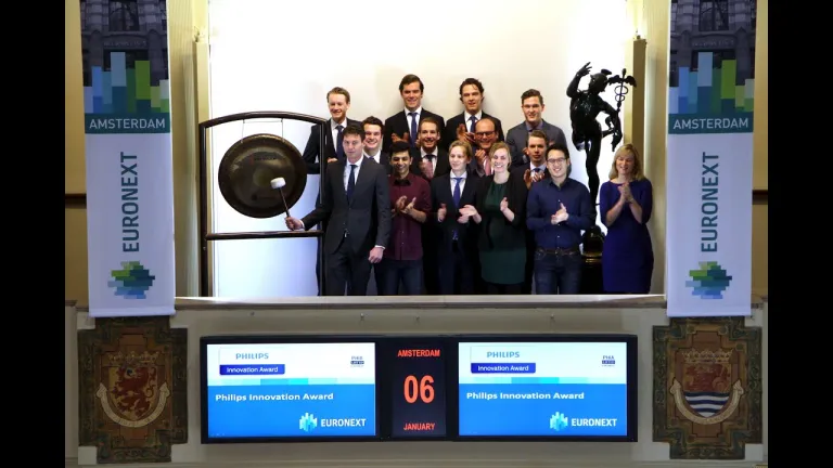 Het bestuur van de Philips Innovation Award opent op de Amsterdamse beurs de handel met een gongslag om de 11e editie van de grootste studentenondernemersprijs van Nederland in te luiden. Het bestuur wordt vergezeld door Daan van Manen, verantwoordelijk voor de historische splitsing van Philips. Pearltect, Printr en Blue Battery, drie finalisten van de 10de editie van de Award, zijn hierbij ook aanwezig.