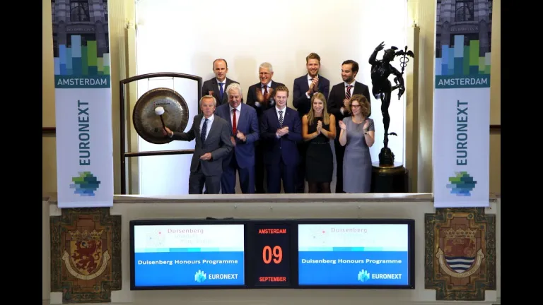 Vanaf 1 september 2015 zijn de opleidingsprogramma’s van de Duisenberg School of Finance geïntegreerd in de Honours programma’s van de Vrije Universiteit Amsterdam en de Universiteit van Amsterdam tot het Duisenberg Honours Programme. Ter gelegenheid hiervan luidt Willem Verschoor, decaan van de Faculteit Economische Wetenschappen en Bedrijfskunde van de Vrije Universiteit, de beursgong.