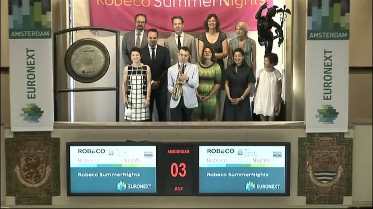 Robeco en Het Koninklijk Concertgebouw hebben hun 27-jarige partnership in de vorm van de Robeco SummerNights met opnieuw drie jaar verlengd. Aanleiding voor beide partijen om de handelsdag op de Amsterdamse beurs te openen. Hester Borrie, lid van de Group Management Board, Marketing & Sales bij Robeco luidt de gong vergezeld door Simon Reinink, algemeen directeur van Het Concertgebouw. Voorafgaand aan de ceremonie verzorgt jazzmusicus Benjamin Herman een zomers optreden.