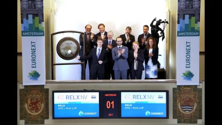 Nick Luff, CFO van RELX NV (ticker symbol: RELX), opent de handelsdag op de Amsterdamse beurs en markeert hiermee de officiële naamsverandering van de in Amsterdam genoteerde aandelen van Reed Elsevier NV naar RELX NV. Deze kortere en meer moderne naam weerspiegelt de transformatie naar een bedrijf dat zich richt op technologie, content en data-analyse, waarbij de link met de rijke historie behouden blijft.