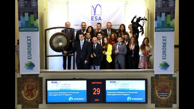 Studenten van het Executive Masters in Financial Management programma (XFM), een partnership van de Rotterdam School of Management (RSM), Erasmus Universiteit en ESA business school in Beirut, bezoeken Beursplein 5 en openen de beurshandel. XFM is een parttime academisch programma op maat gemaakt voor professionals in posities waar financiële informatie cruciaal is voor uitstekende prestaties.