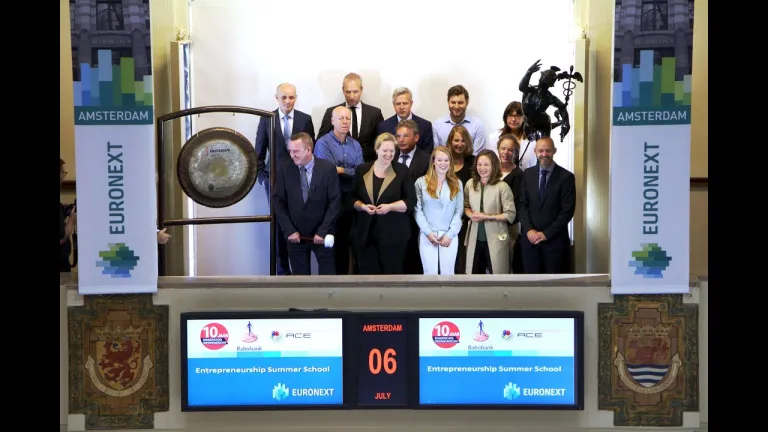 De 10de editie van de jaarlijkse Summerschool Ondernemerschap, georganiseerd door Rabobank Amsterdam en het Amsterdam Center for Entrepreneurship (ACE), wordt feestelijk gestart door het luiden van de gong. Prof. dr. Enno Masurel, wetenschappelijk directeur bij het Amsterdam Center for Entrepreneurship én initiator van de Summerschool Ondernemerschap, opent samen met studentondernemers, het ACE team en Rabobank Amsterdam de handelsdag.