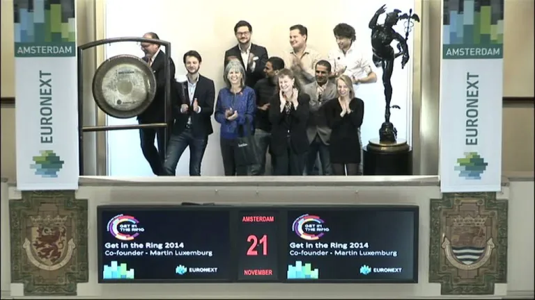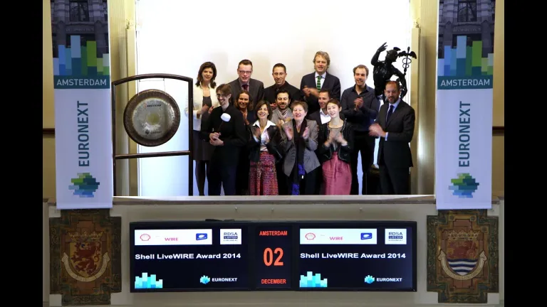 Jan Jonk, mede-oprichter van GainPlay Studio en finalist van de Shell LiveWIRE Award 2014, luidt de gong om de handelsdag te openen. Dit doet hij in het bijzijn van de 3 andere finalisten, Klaas Engelsma van Shell en Linde Gonggrijp van de Kamer van Koophandel. Later vandaag wordt de winnaar van de Shell LiveWIRE Award 2014 bekendgemaakt tijdens een award ceremony op Shell Technology Centre Amsterdam.