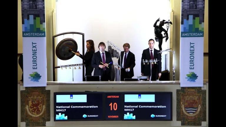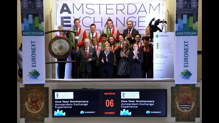 De Amsterdamse beurs viert met een slag op de gong het 1-jarig bestaan van de ‘Amsterdam Exchange (AEX) Experience’, een interactieve rondleiding door de beurs waarin uitleg wordt gegeven over de rol en het belang van de beurs voor de economie, de genoteerde ondernemingen, de beursgeschiedenis en de op de beurs verhandelde producten.