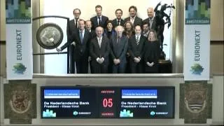 De president van de Nederlandsche Bank (DNB), Klaas Knot, opent de beurshandel met een slag op de gong. Met deze slag markeert de president het 200-jarig bestaan van DNB.