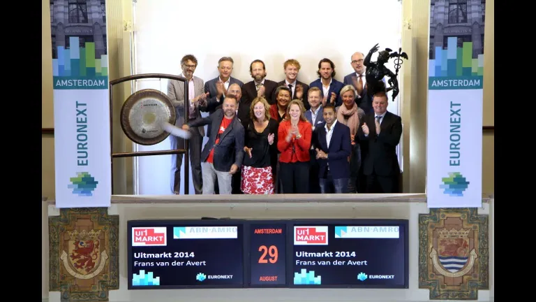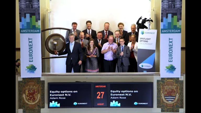 Met een slag op de gong wordt de introductie van aandelenopties op Euronext N.V. gevierd.