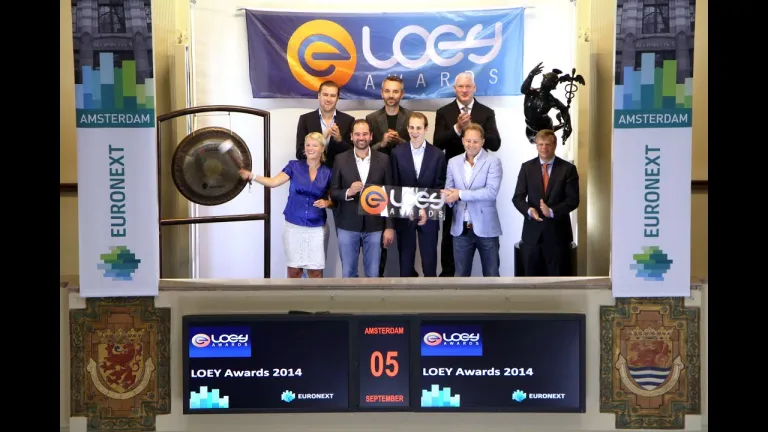 De winnaars van de LOEY Awards 2014, de prijzen voor de beste ondernemers in de Nederlandse online industrie, bezoeken Beursplein 5 en luiden de beursgong.