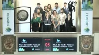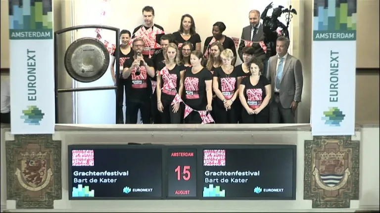Klarinettist Bart de Kater opent met een gongslag de beurshandel op Beursplein 5. Dit gebeurt ter gelegenheid van de opening van Grachtenfestival Amsterdam.