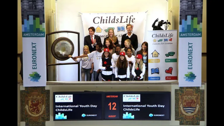 Met een slag op de beursgong vraagt ChildsLife International aandacht voor de Internationale Dag van de Jeugd.