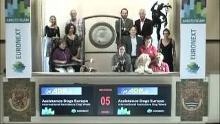 Met een gongslag opent Caroline Vink samen met Viktor, de assistentiehond die haar naast de rolstoel begeleidt, de beurshandel. Dit doet zij namens Assistance Dogs Europe voor de wereldwijde week van de assistentiehond.