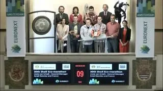 Linda van Schaik, General Manager Retail Benelux en Frankrijk, en leden van het Shell Eco-marathon team Euregiorunners luiden de beursgong voor de 30e Shell Eco-marathon, die van 15 tot 18 mei in Rotterdam plaatsvindt.