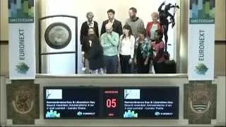 Amsterdams 4 en 5 mei comité bezoekt Beursplein 5 voor het luiden van de gong ter ere van Dodenherdenking en Bevrijdingsdag.