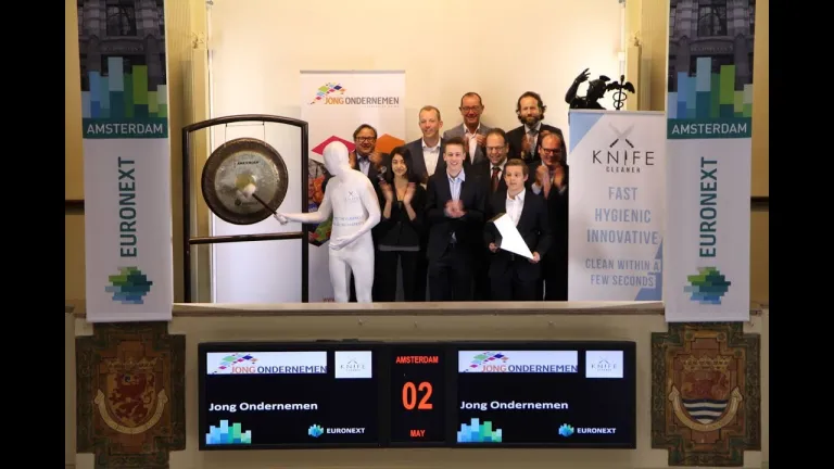 Het studentenbedrijf KnifeCleaner, bedenkers van de professionele messenschoonmaker, luidt de gong samen met Arko Veefkind, directeur stichting Jong Ondernemen. KnifeCleaner schreef zich onlangs in bij de Kamer van Koophandel, nog tijdens het ondernemerschapsprogramma van de stichting.