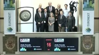 Directeur van het Aids Fonds, Ton Coenen, luidt samen met de bestuursleden van de AmsterdamDiner Foundation de gong op de Amsterdamse beurs.