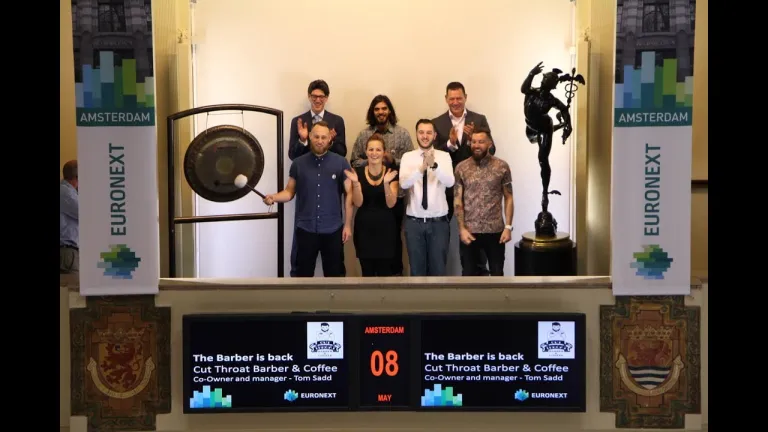 In 1934 werd de Beurs Salon geopend in het beursgebouw op Beursplein 5. Voordat zij de handelsvloer betraden werden beurshandelaren op klassieke wijze geknipt en geschoren. De barbier verdween echter in 1996 uit het beurspand. Tot nu! De beursbarbier keert terug nu Beursplein 5 weer druk bevolkt is door handelaren. De barbiers van Cut Throat Barber & Coffee uit de Warmoesstraat doen een oude traditie herleven en zullen beursmedewerkers en- handelaren op afspraak knippen en scheren met hun ‘Cut Throat Shaves’, in een van de authentieke kappersstoelen te Beursplein 5. Beursbekendheid Peter Paul de Vries nam als eerste plaats in de kappersstoel om ‘geknipt en geschoren’ te worden. Mede-eigenaar en manager, Tom Sadd, luidt de gong.