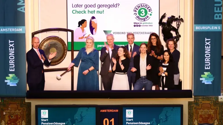 Renee Martius, Manager afdeling Leven & Inkomen bij het Verbond van Verzekeraars, heeft de gong geluid ter viering van de start van de Pensioen3daagse 2022.