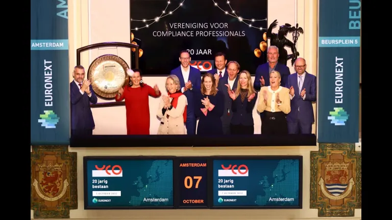 Vandaag heeft Michelle Fisser, Bestuur VCO en Founder Compliance in Motion, de gong geluid om het 20-jarig bestaan van de Vereniging voor Compliance Professionals te vieren. De vereniging heeft daarom een evenement georganiseerd in het ‘De La Mar Theater’ onder het thema ‘Compliance in Transformation’. De groep werd verwelkomd door Tjerk de Jong, Team Lead Member Compliance, en René van Vlerken, Head of Listing van Euronext Amsterdam.