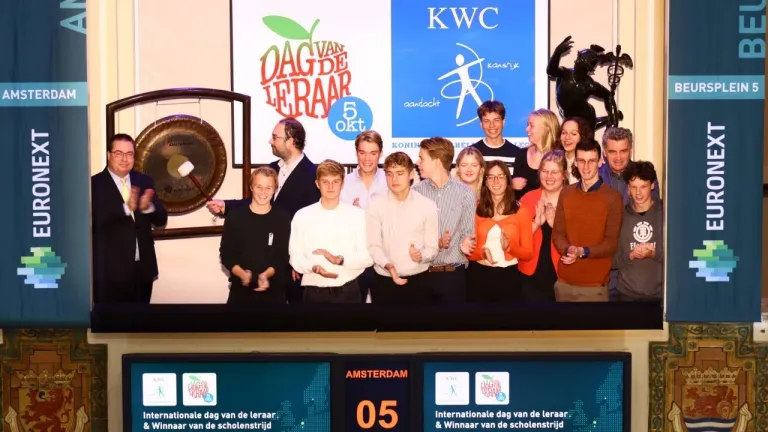 Ter gelegenheid van de viering van internationale Dag van de Leraar opent Rens van Stigt, docent (bedrijfs)economie aan het Koningin Wilhelmina College te Culemborg samen met zijn leerlingen de beurs. Deze eer is hem gegund omdat hij eerder Scholenstrijd heeft gewonnen. Destijds kon de traditionele beursopening niet doorgaan door de toen geldende Corona maatregelen..