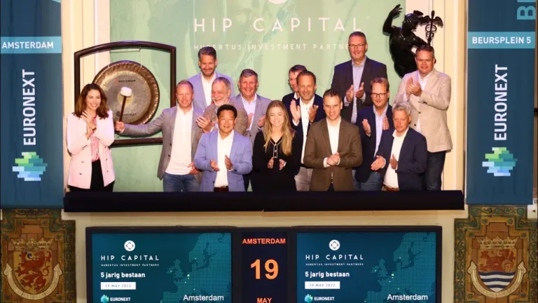 Dick Hubertus, founding partner van HIP Capital beleggingsspecialisten, luidde vanochtend de gong ter ere van haar eerste lustrum.