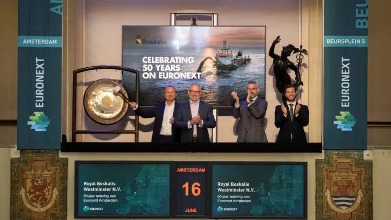 Vanochtend luidden Carlo van Noort (CFO) en Martijn Schuttevaer (Director IR & Communications) van Koninklijke Boskalis Westminster N.V. de gong om hun 50-jarige notering aan Euronext Amsterdam te vieren. Ze werden verwelkomd op het Beursplein door de CEO van Euronext Amsterdam, Simone Huis in ’t Veld en Head of Listing René van Vlerken.