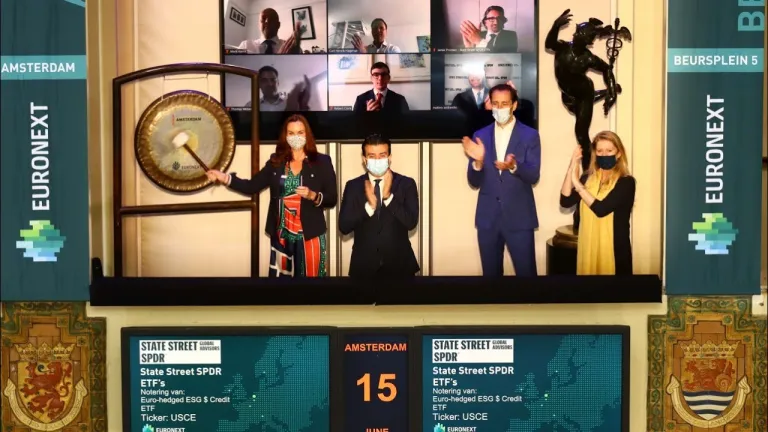 Vandaag verwelkomt Euronext Amsterdam 3 nieuwe ESG ETF’s uit de Dividend Aristocrats familie van @StateStreetETFs. De SPDR Dividend Aristocrats behoren tot de grootste Dividend ETF’s in Europa en bieden beleggers een combinatie van stabiele dividenden uit duurzame beleggingen. Om de nieuwe aandelenklasse op Euronext Amsterdam te vieren, luidde Natalie Compagne, Marketing Manager van SPDR ETF’s samen met Marianne Aalders, Communicatie Manager van Euronext Amsterdam, de gong.