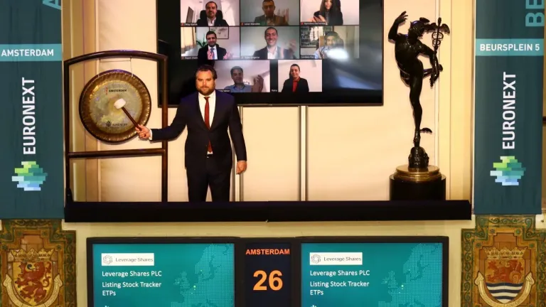 Today, Leverage Shares PLC lists Stock Tracker ETPs. It contains approximately nine single-stock trackers, making investing in popular American stocks more accessible to a broader audience. To celebrate the listing, Raj Sheth, Sales Director at Leverage Shares PLC, sounded the gong virtually with Robin van Rijn, Client Relationship Manager at Euronext Amsterdam.
