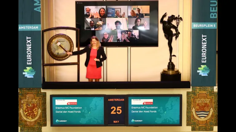 Het Daniel den Hoed Fonds haalt geld op voor kankeronderzoek in het Erasmus MC Kanker Instituut. Zo organiseren ze onder meer de Tocht tegen Kanker. Ter gelegenheid hiervan luidde Bart Gerretsen, Voorzitter Raad van Toezicht Erasmus MC Foundation en Partner Corporate Litigation bij Windt Le Grand Leeuwenburgh, vandaag virtueel de gong. Hij werd verwelkomd door Marianne Aalders, Communicatie Manager bij Euronext Amsterdam, die de gong namens hem luidde op Beursplein 5.