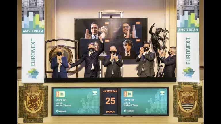 Nick Aperghis, CFO van European FinTech IPO Company 1, en Ben Davey, CIO van European FinTech IPO Company 1, luidden deze morgen de traditionele gong tijdens een virtuele ceremonie. Zij deden dit in het bijzijn van Simone Huis in ’t Veld, CEO van Euronext Amsterdam, en René van Vlerken, Head of Listing van Euronext Amsterdam. Met de gongceremonie vieren zij de Initial Public Offering van deze SPAC (Special Purpose Acquisition Vehicle).