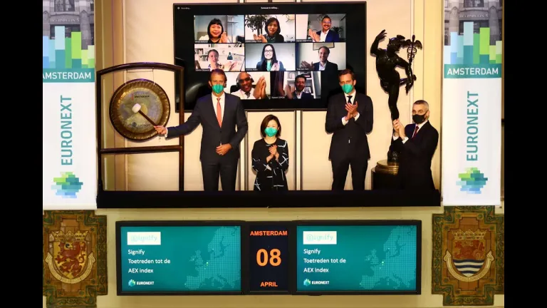Signify viert vandaag dat zij zijn toegetreden tot de AEX Index®, de belangrijkste Nederlandse nationale index met de 25 grootste bedrijven die genoteerd zijn op Euronext Amsterdam. Javier van Engelen, CFO van Signify, was daarom uitgenodigd om de gong te luiden. Hij deed dit samen met onder andere Yue Cui, CSR en Programma Manager bij de Signify Foundation en Philip van der Valk, Investor Relations Officer van Signify. René van Vlerken (Head of Listing Euronext Amsterdam) verwelkomde hen.